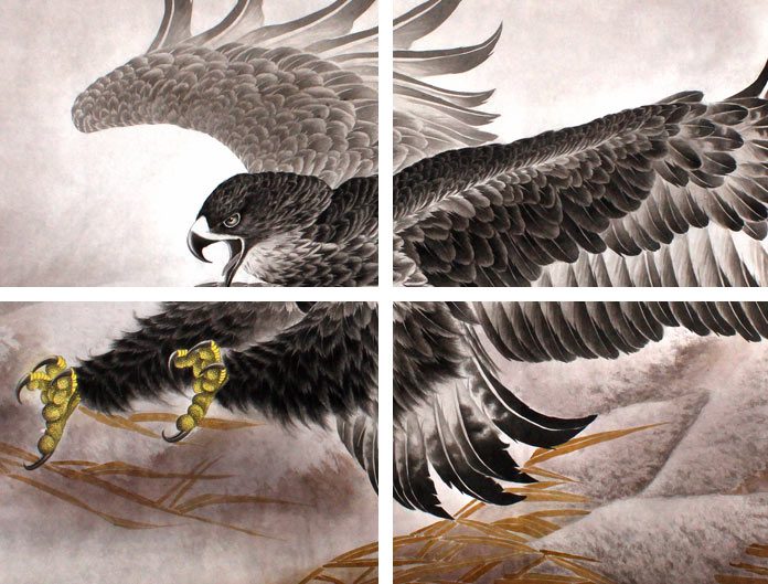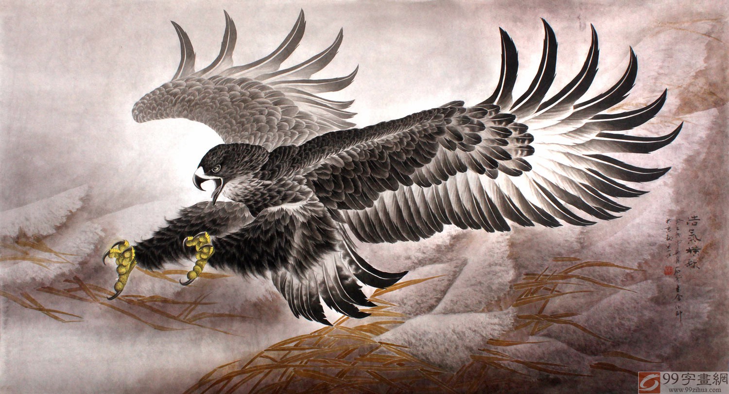 【作品简评】 葛化帅先生的这幅雄鹰国画《浩气横秋》,横穿茫茫苍天之中,一改过去常规姿势,好像要冲出画面,展开双翅,劲健的脚爪向前伸展着,给人一种激励、鼓励的启发。艺术家葛化帅先生的雄鹰图各有千秋,画面形象逼真,是勇者无畏的品格象征,典雅的背景做衬托凸显雄鹰的奋进、高贵,让人产生乐观向上的良好心态。特别是悬挂于儿女书房、办公室更有励志作用。祝学业有成、榜上有名;事业蒸蒸日上、前途一片光明等!