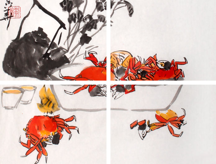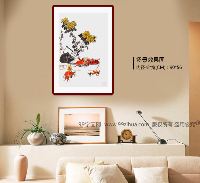 【作品简评】 (99字画网艺术评论员晓曼)刘纪先生的这幅螃蟹菊花图,菊花凌霜傲雪,不为严寒所屈服,它金蕊银花,争奇斗艳默默地开放着。螃蟹颜色亮丽,色泽鲜艳,两只酒盅、一个酒壶体现作者一种悠然怡得的心情。有祝寿之意,是餐厅字画、客厅字画之选,推荐选购!