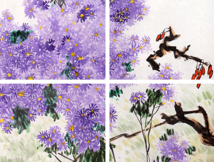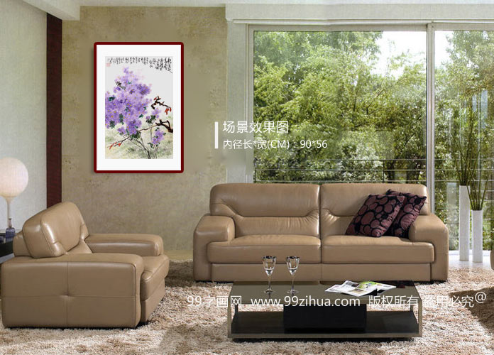 【作品简评】 (99字画网艺术评论员晓曼) 此幅花鸟画作品《杞菊延年》笔墨苍润,设色浓艳,色与墨合用,大片菊花花开艳丽,有紫气之祥兆,青青的背景作衬托,更显高贵、典雅。表现了菊花特有的魅力,那种既艳且傲、既傲且庄的姿态跃然纸上。建议客厅、玄关、走廊等悬挂装饰!