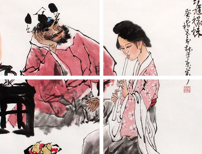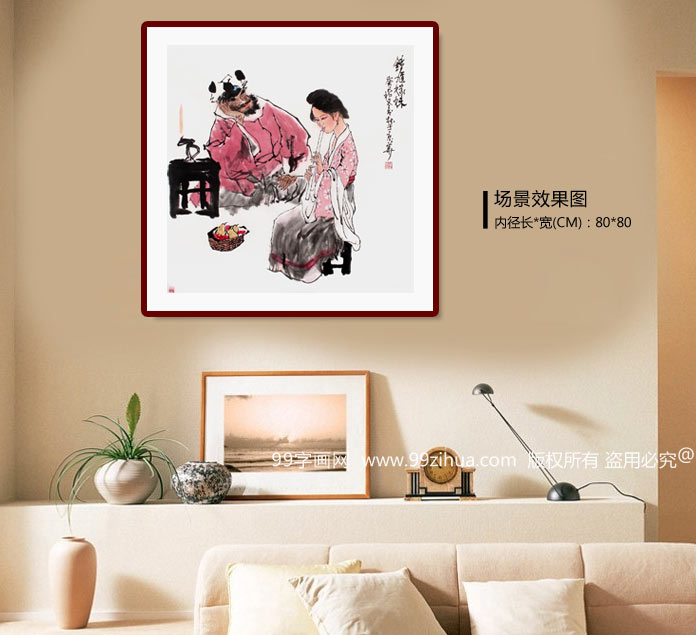 【作品简评】 (99字画网艺术评论员晓曼) “钟馗嫁妹图”是古代绘画和戏剧的一个重要题材,广受欢迎。钟馗虬髯黑面,面貌丑恶,其妹双手握箫,心思沉重,红润脸面白里透红,身姿妩媚,衣绸飘舞,面前的煤油灯在燃烧,地上放有梨、樱桃等硕果,看上去正是傍晚时刻,此情此景表达的逼真形象,乃精品之作!