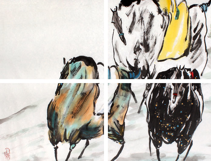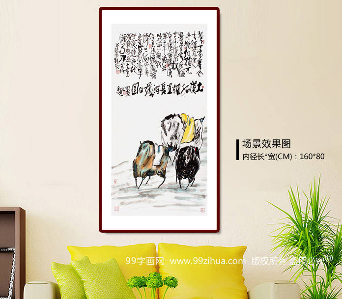 乌沉沉的边塞,黄沙从南方大漠中吹来,太阳向西方沉落。中国曾以三十万战士对付匈奴,至今只见到沙场上累累尸骸,而没有人怜惜这些塞上孤军。刘纪先生借此历史背景来抒发当时战士的勇猛,将骏马的英姿淋漓尽致地绘之其中,线条流畅的书法在艺术的映衬下更显俊秀雅致,无乱是观赏还是赠送友人皆为精品之作!