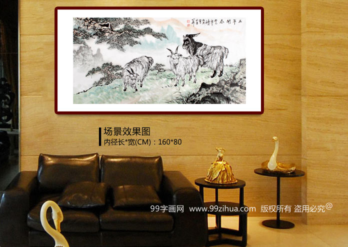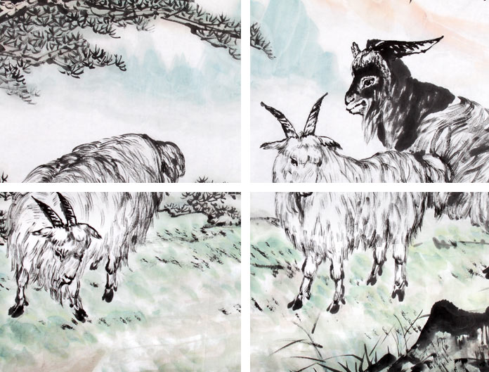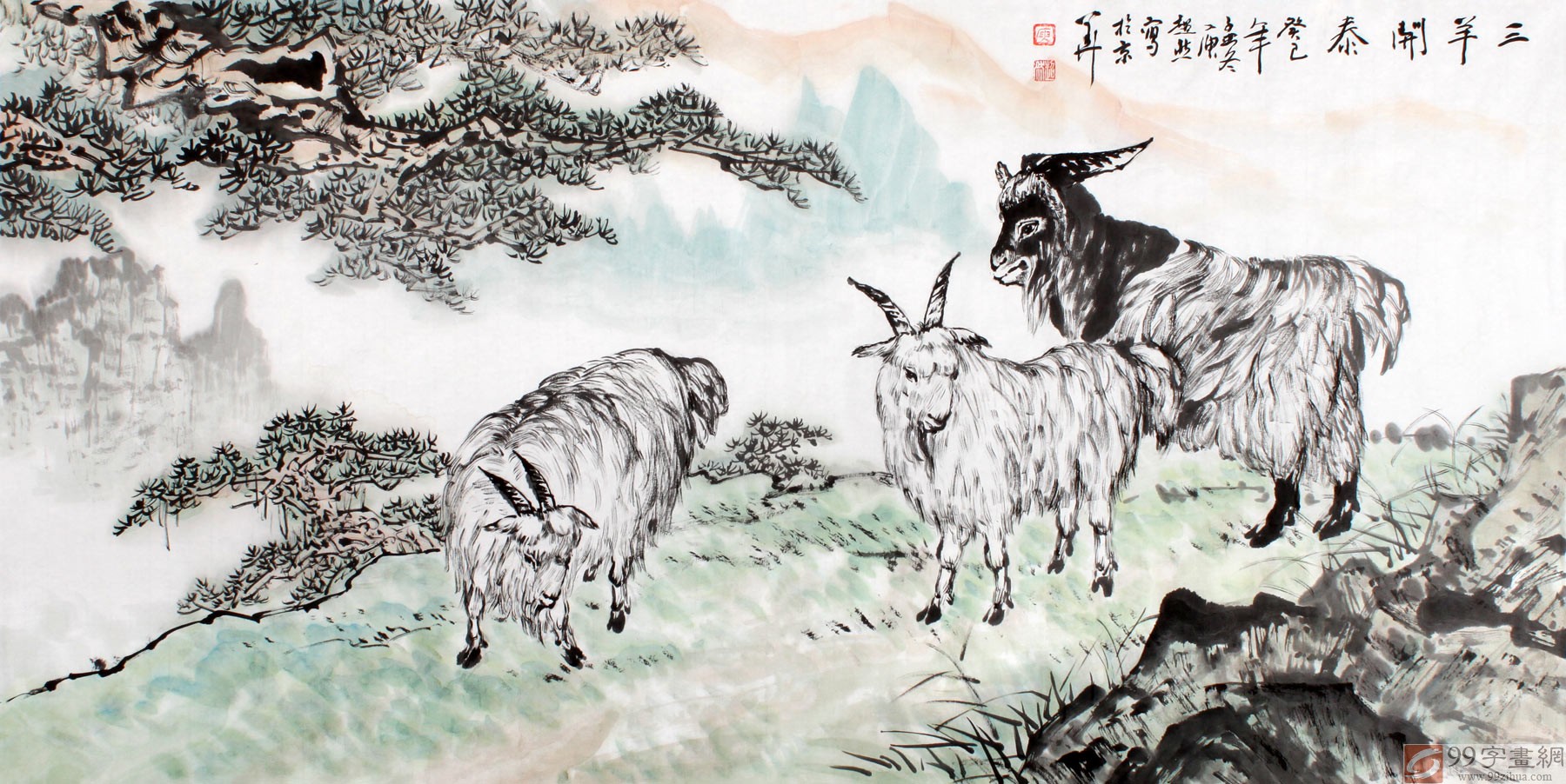 【作品简评】 “三羊开泰”是祥兆,寓意发财、吉祥等,有吉亨之象。庾超然先生的这幅动物画作品《三羊开泰》幅绘了三只羊的图画,松柏苍天,指针茂密,在茫茫的草地上,三只羊各有所姿,形态各异,构图巧妙,寓意吉祥,不仅美化了整幅画面,而且招来吉利之谓,可以带来好运。