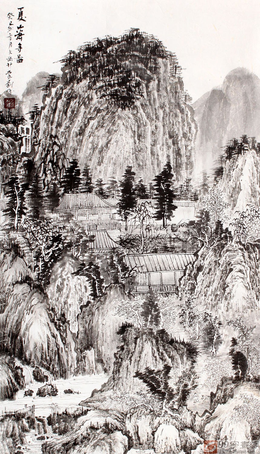 【作品简评】(99字画网艺术评论员玉洁)此幅俊雅秀丽山水画《夏山萧寺图》,描绘一幅夏日凉爽、山峰巍峨、山势笔挺、树木浓郁山水画。山间房屋数舍,树木苍天茂密,山峰层峦叠嶂,座座掩映其中。山脚下流水潺潺,生生不息,为炎热的夏日增添一丝丝的凉意。整幅山水画水墨设色,构图饱满,线条流畅自如,乃山水画之精品!