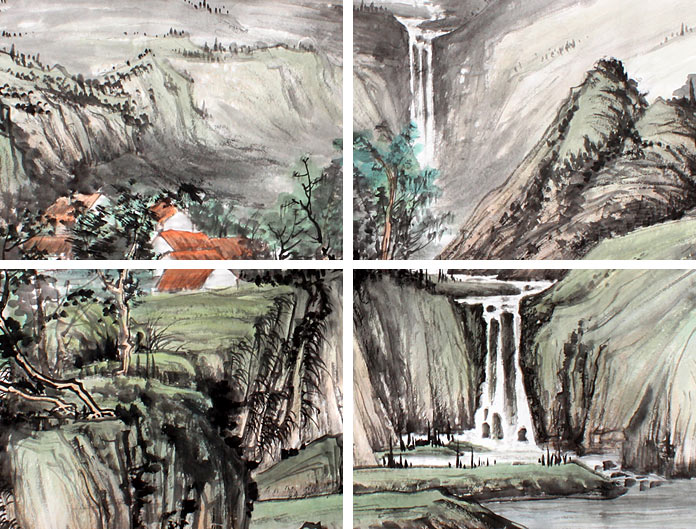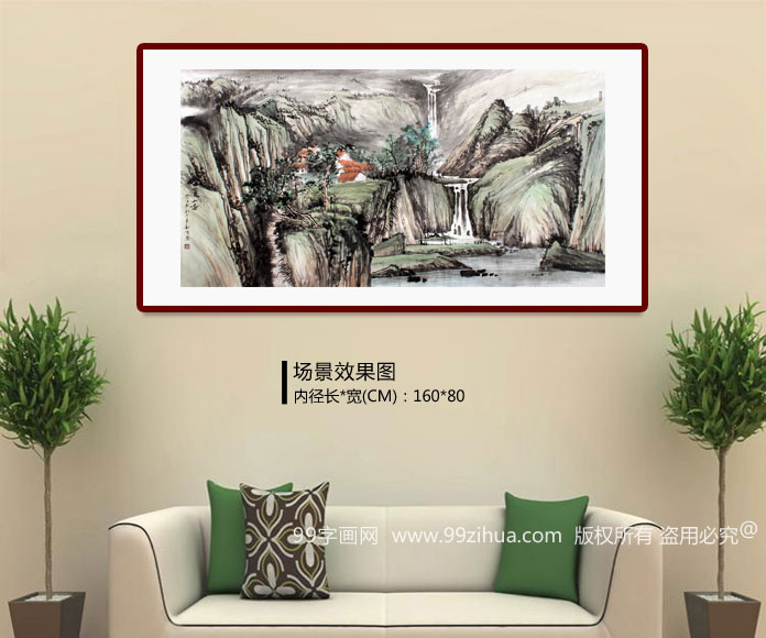 【作品简评】 刘洋先生的这幅彩墨山水画《夏山图》,构图饱满,造型奇特,山峰层峦叠嶂,山势巍峨挺拔,山间的瀑水一泻千里、飞奔直下,汇聚一起流入宝谭,有聚财之意。山脚下房屋数舍坐落其间,房顶以褚红色绘之,别有一番风情蕴含其中,山环水绕,水流不息,有聚财、生财之意,挂在办公室寓意财源滚滚;挂于客厅招财又吉利,又为居室增添了美感,何乐而不为呢!