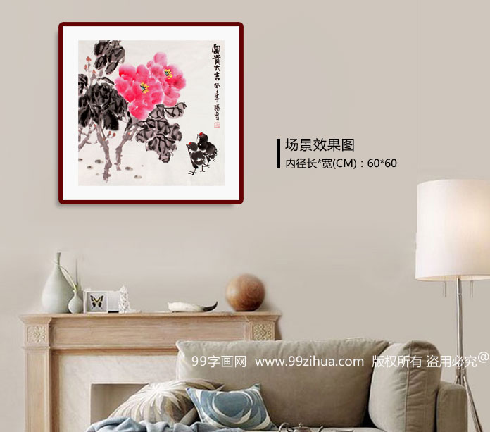 【作品简评】(99字画网艺术评论员晓曼)李胜春先生的这幅牡丹画作品《富贵大吉》,绘几簇牡丹在春天盎然开放,花大色艳,树干老辣劲健,花蕊清新亮丽,树下两只小鸡仰头赏景,动作可爱,形态逼真,一幅吉祥风水牡丹画映入画幅中,推荐选购!