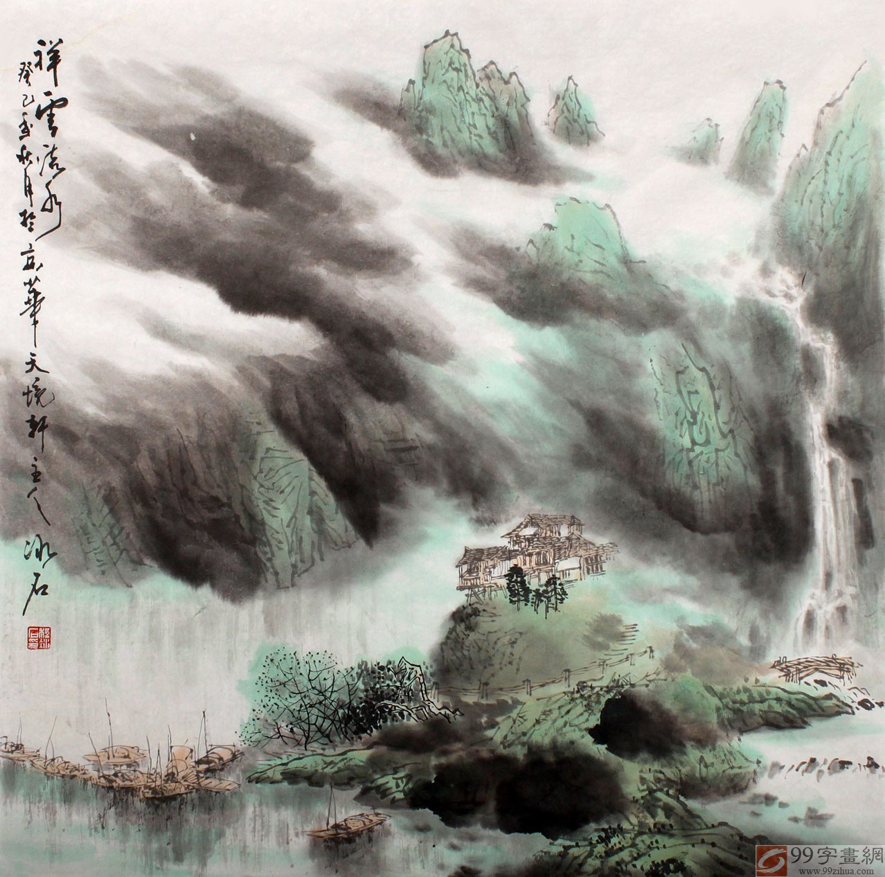 【作品简评】 (99字画网艺术评论员玉洁)程冰石先生的山水画作品《祥云流水》,绘烟云滚滚而来,用墨酣畅淋漓,帆船聚集其中划行,山间树木茂密葱绿,一排排房屋坐落其间,山间的小路曲曲折折,绵延悠长,环绕其中,飞瀑从天而将,一泻千里。一幅祥云秀雅景色映入画幅中,推荐选购!