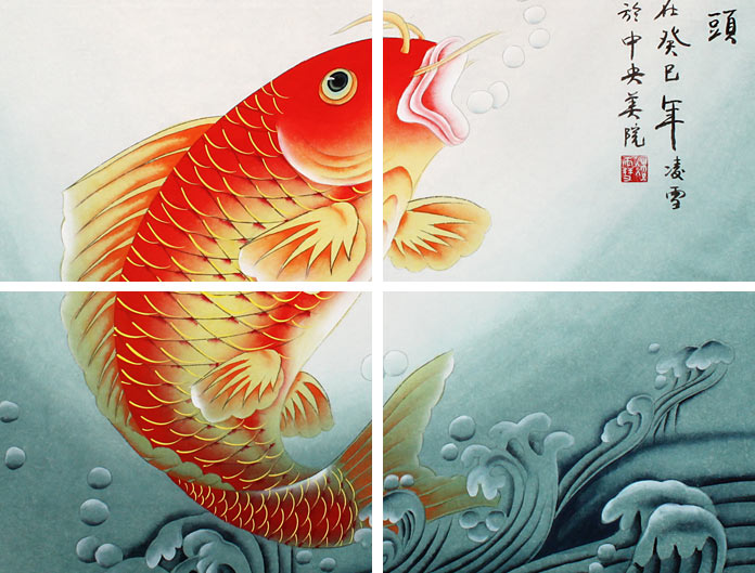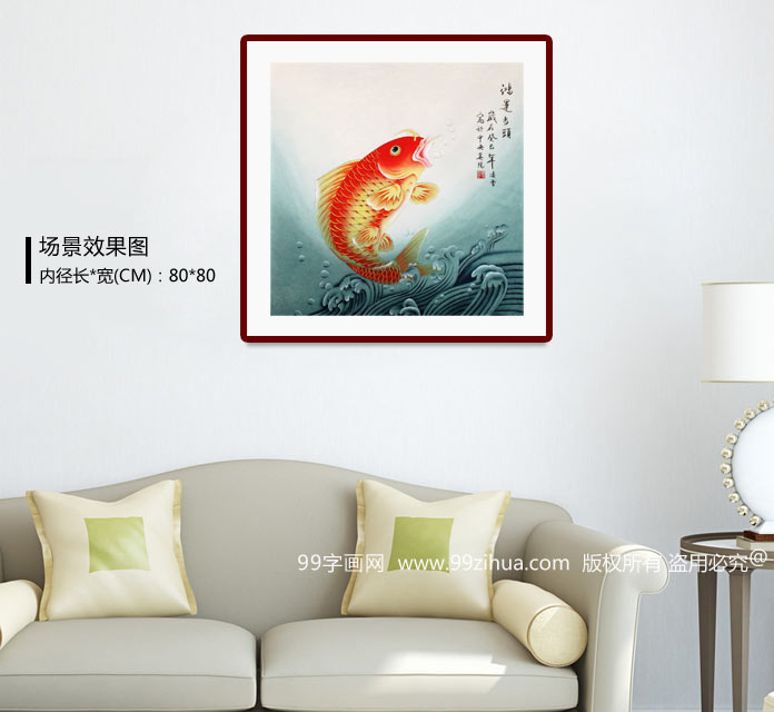 【作品简评】(99字画网艺术评论员晓曼) 凌雪老师的这幅国画鱼《鸿运当头》,绘一条跳跃鲤鱼,嘴吐水泡,在深水海洋中跳动着,溅起的浪花向上翻腾着、滚动着,鲤鱼鱼鳞有秩序地排列着,张开圆圆的大眼睛,吐珠而来,祈福而到。整幅作品气韵生动,雅俗共赏,体现一种吉祥、和谐、宁静的美,挂于客厅祝生活幸福吉祥、年年有余;挂于酒店祝生意得厚利等。