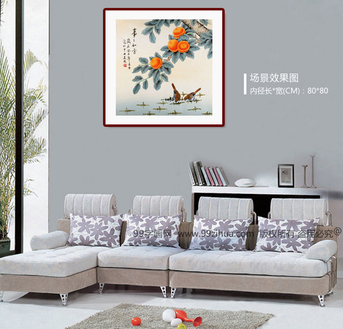 【作品简评】(99字画网艺术评论员晓曼) 凌雪老师的这幅柿子画作品《事事如意》,绘右侧斜入画面,柿子果实圆润,富含光泽,两只雀鸟在柿子下觅食,动作可爱,一幅温馨祥和的画面映入画幅中,推荐悬挂!