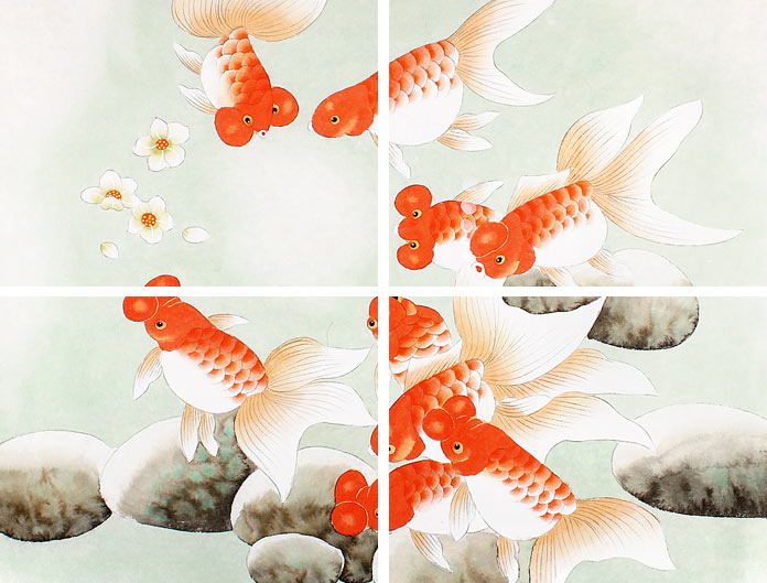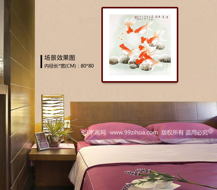 【作品简评】(99字画网艺术评论员晓曼)此幅九鱼图《鸿运当头》,绘九条金鱼在荷池中畅游其中,礁石坐落其中,池水清澈见底,九条金鱼活灵活现地映入画幅中,姿态各异,动作可爱逼真,一幅风水吉祥含义映入画幅中,是家居良好风水含义。