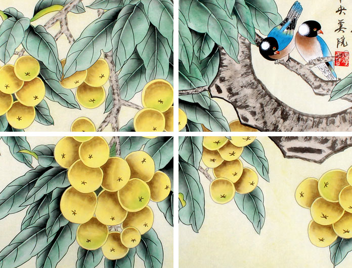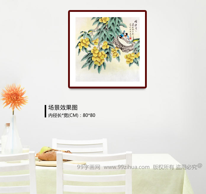 【作品简评】(99字画网艺术评论员晓曼) 凌雪老师的花鸟画作品题材广泛,造型各异,繁花紧蹙,花开艳丽,用笔细腻洒脱,设色亮丽高雅。此幅国画作品《硕果累累》,绘一株枇杷映入画幅中,硕果飘香,累累压枝,两只鸟儿在枝干上休憩玩耍,整幅作品构图饱满,造型各异,一幅吉祥画面映入画幅中,推荐选购!