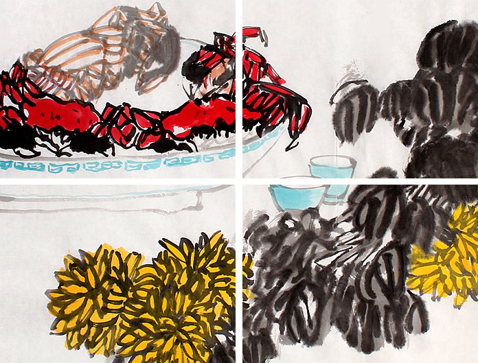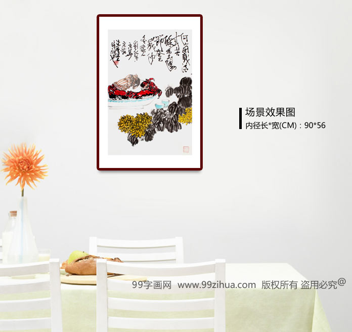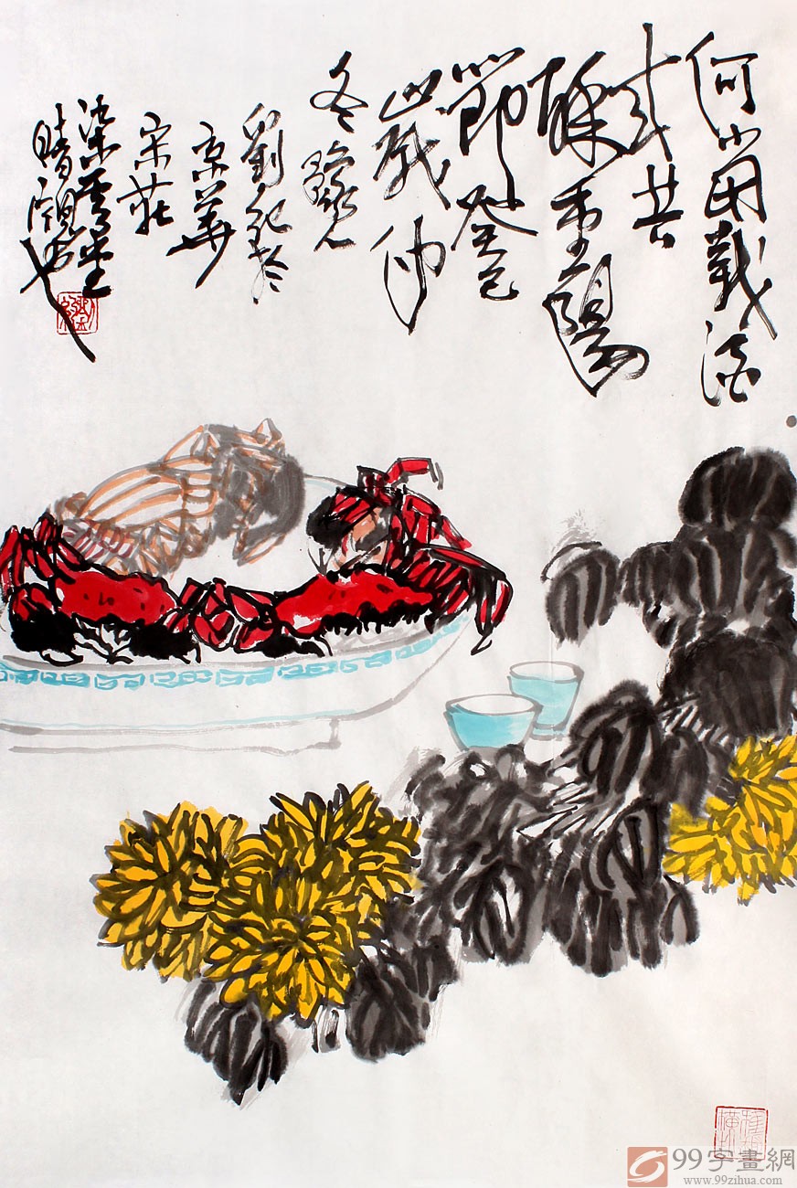 【作品简评】 (99字画网艺术评论员晓曼) 刘纪先生的这幅螃蟹菊花图《共度重阳节》,菊花凌霜傲雪,不为严寒所屈服,它金蕊银花,争奇斗艳默默地开放着。螃蟹在椭圆形的盘子里,颜色亮丽,色泽鲜艳,有祝寿之意,旁边两只酒盅体现作者一种悠然怡得的心情。一幅悠闲、惬意的画面映入画幅中,建议茶室装饰悬挂!