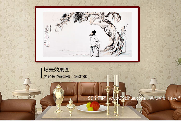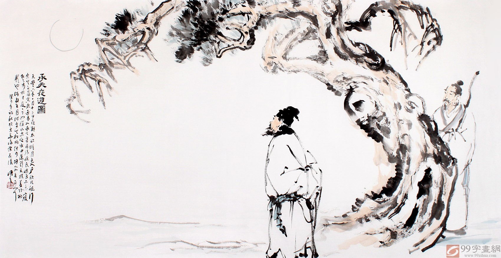 【作品简评】(99字画网艺术评论员晓曼)陈漫之先生的这幅人物画作取材于苏轼的妙文《承天寺夜游》,绘苏轼和友人夜游承天寺的情景,画面唯以古柏明月表现文中意境,构图洗练,寓目之际,使人仿佛置身一片皎洁的月光之下。人物的刻画笔法简练、富有神韵。