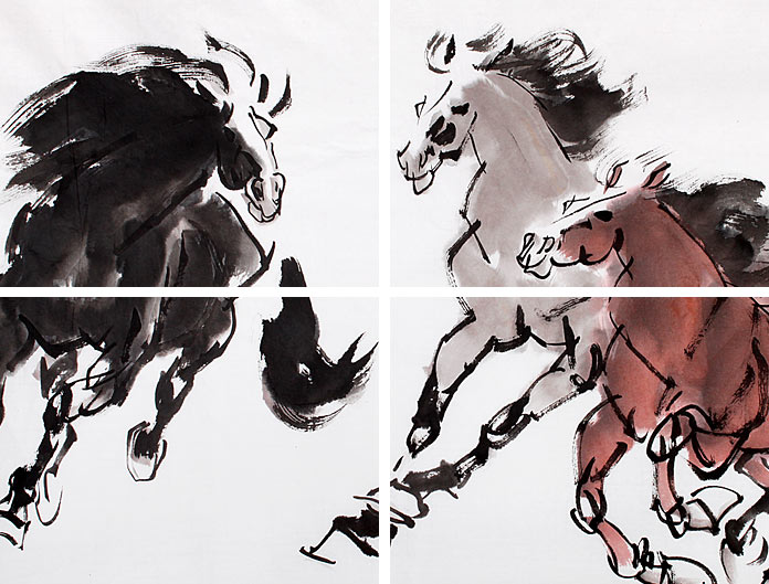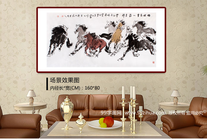 【作品简评】 此幅八骏图《八骏呈祥》以奔驰如风、势如破竹的气势,一路狂奔,给人以奋进激昂的精神美感。八骏或前行,或俯首,或对望,或并行,泼墨自然,线条流畅,渗透一种勇于超越,大展宏图之意。装饰在办公室、客厅定会收到相辅相成之效,昭显朝阳之气。
