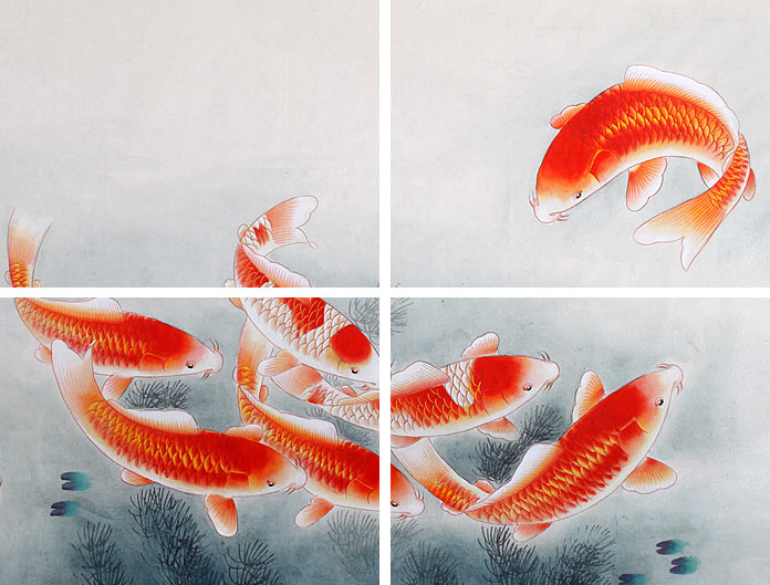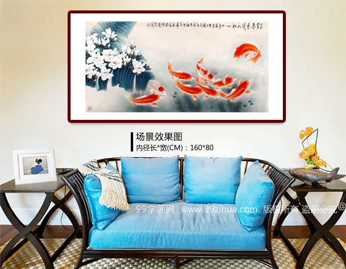 【作品简评】董书林老师的这幅九鱼图,幅绘芭蕉、玉兰、九鱼满载吉祥、美满之意,“九”取长长久久之意。“鱼”取其万事如意。九条可爱的鱼在嬉戏,寓意是吉祥如意。是最常见的家居客厅风水字画。