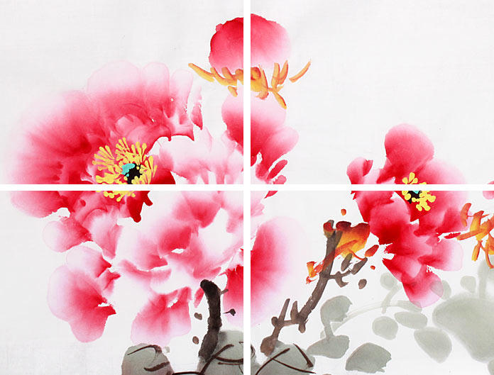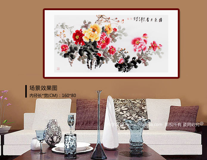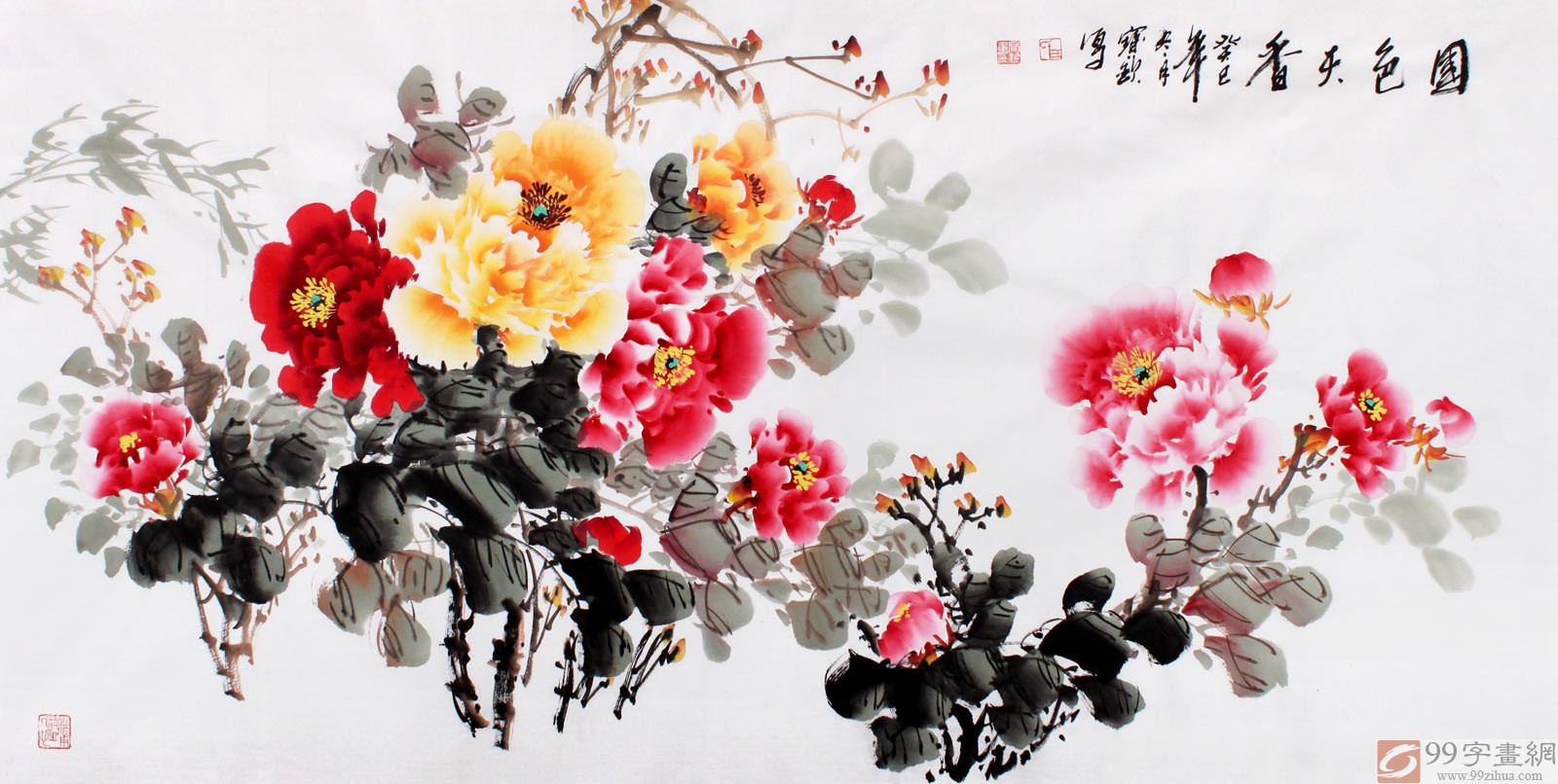 【作品简评】 王宝钦先生的这幅牡丹画作品《国色天香》,红艳似火,艳而不俗,花大色艳,花朵在微风的吹拂下或怒放,或含苞,红花绿叶搭配的相得益彰、恰到好处,一幅安详亮丽的牡丹画作品映入画幅中,牡丹有大富大贵之祥瑞,寓意和平富贵!