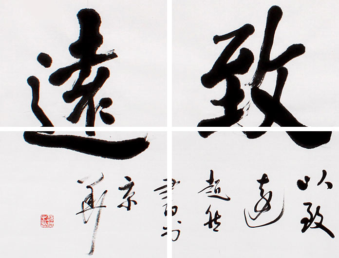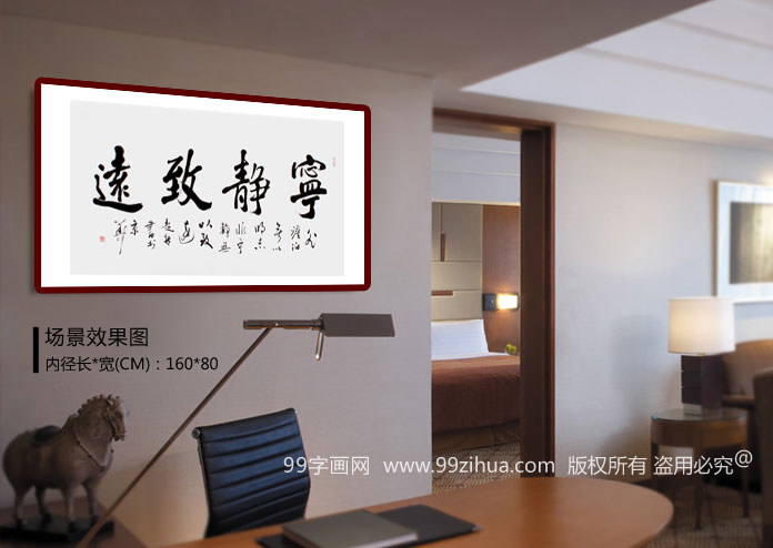 【作品简评】 “宁静致远”意思是说,只有平稳静谧的心态,不为杂念所左右,静思反省,才能实现更远的目标。庾超然先生以其书法绘之,将自己的远大理想书写于画幅中,教导后人,勉励自己。