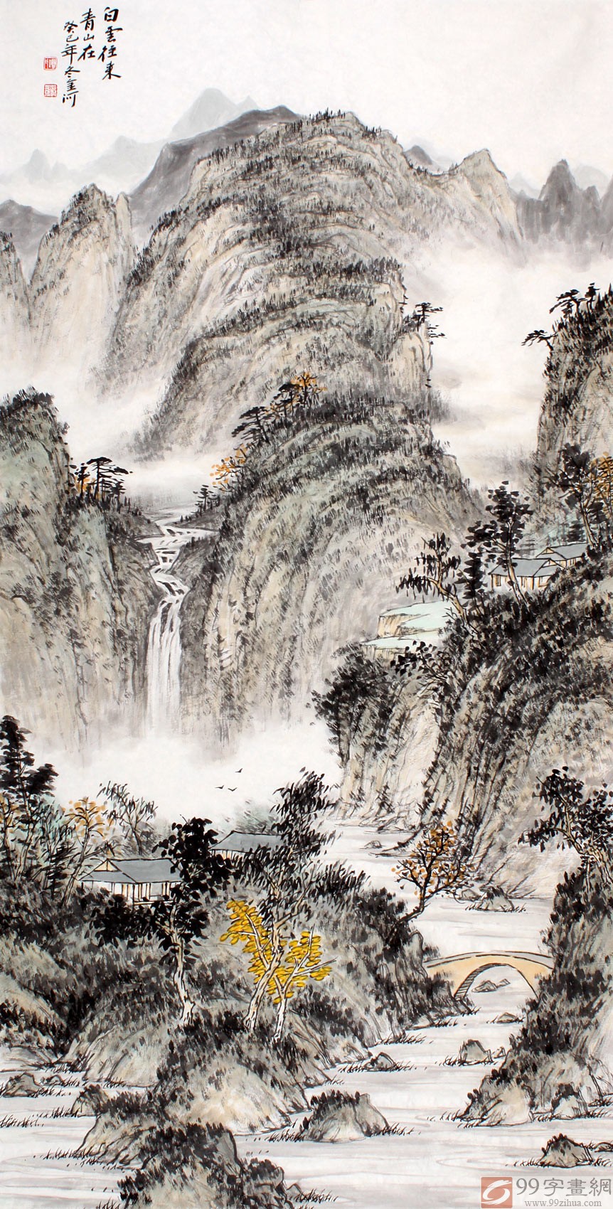 【作品简评】此幅山水画作《白云往来青云在》风格飘渺,意境优美,本幅作品以淡墨色晕染与细腻的笔墨描绘,使得山峰更具层次感,远处山峰巍峨、云雾飘渺,近处嶙峋的山石,笔挺的古松,静谧的房屋,奇秀雅致,带给人一种意境悠远的瑰丽之感,是一幅非常富有诗意的山水画作。