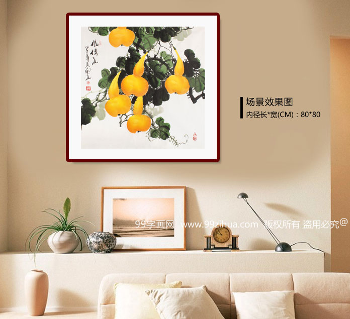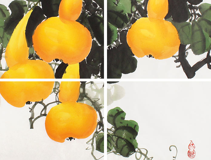 【作品简评】(99字画网艺术评论员玉洁) 此幅水墨葫芦图《福禄画》,绘葫芦藤蔓上,串串葫芦挂满枝头,葫芦黄澄澄,争锋向上攀爬,硕果累累。在国画中,葫芦与福禄谐音,是辟邪之祥物,同时,家有小孩或多病者宜挂葫芦,对健康有利,极易悬挂!