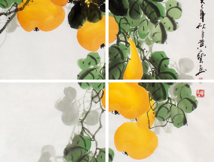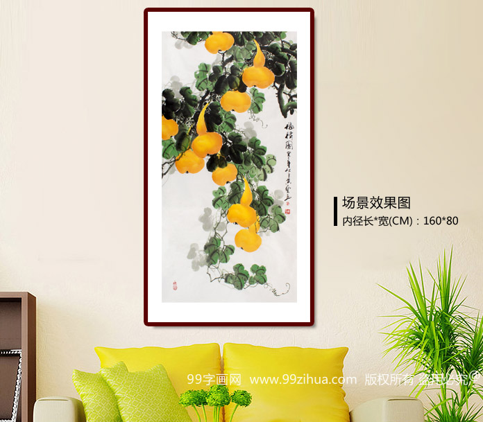 【作品简评】 葫芦具有"福禄"的谐音象征,自古以来就被当作招财纳福的吉祥物;据说在家里悬挂葫芦,能够带来好财运、居家平安健康。民间有“厝内一粒瓠,家内才会富”的说法,意思就是家家户户至少必须摆放一个葫芦,才能够招财致富,可见葫芦是居家必备的开运吉祥物。国画葫芦寓意招财纳福,是吉祥的风水国画。
