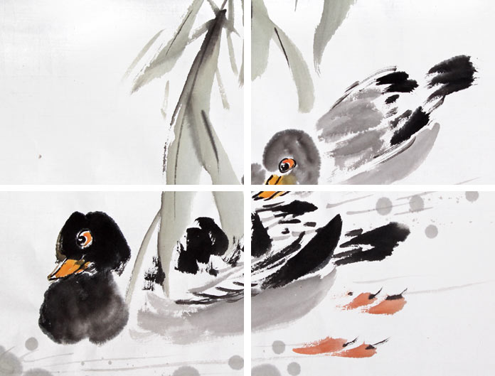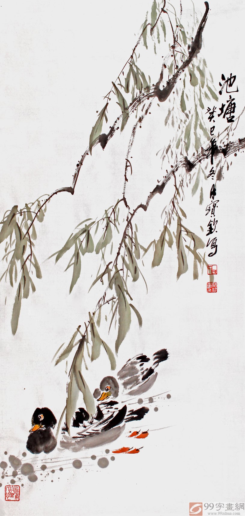 【作品简评】王宝钦先生的这幅花鸟画作品《池塘》,绘几簇树木映入池塘,树叶在微风的吹拂下轻轻摇曳,发出“唰”的响声,两只鸭子在池塘中自由自在地游玩,池水清澈,清静幽雅,挂于居室为画面增添一丝丝美感,不仅装饰了家居,而且彰显主人高雅的艺术氛围,乃精品!