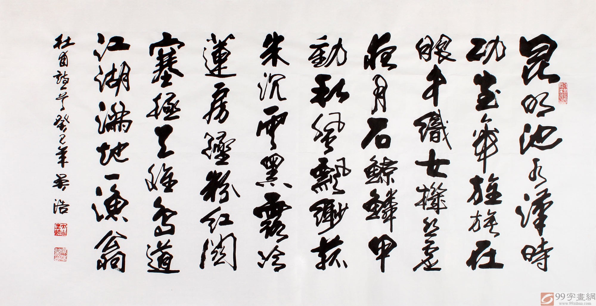 【作品简评】(99字画网艺术评论员玉洁) 吴浩先生的书法众体兼备,功力浓厚,尤以行楷见长,其行楷清新俊逸,刚健朴实,笔圆势方,动静相依,错落有致,抑扬节应,气韵生动,汲取了唐碑风骨,魏晋神韵,寓刚健于婀娜之中,寄雄强于委婉之内,在博涉诸家的基础上形成气势浑厚、苍劲挺拔的独特风格。