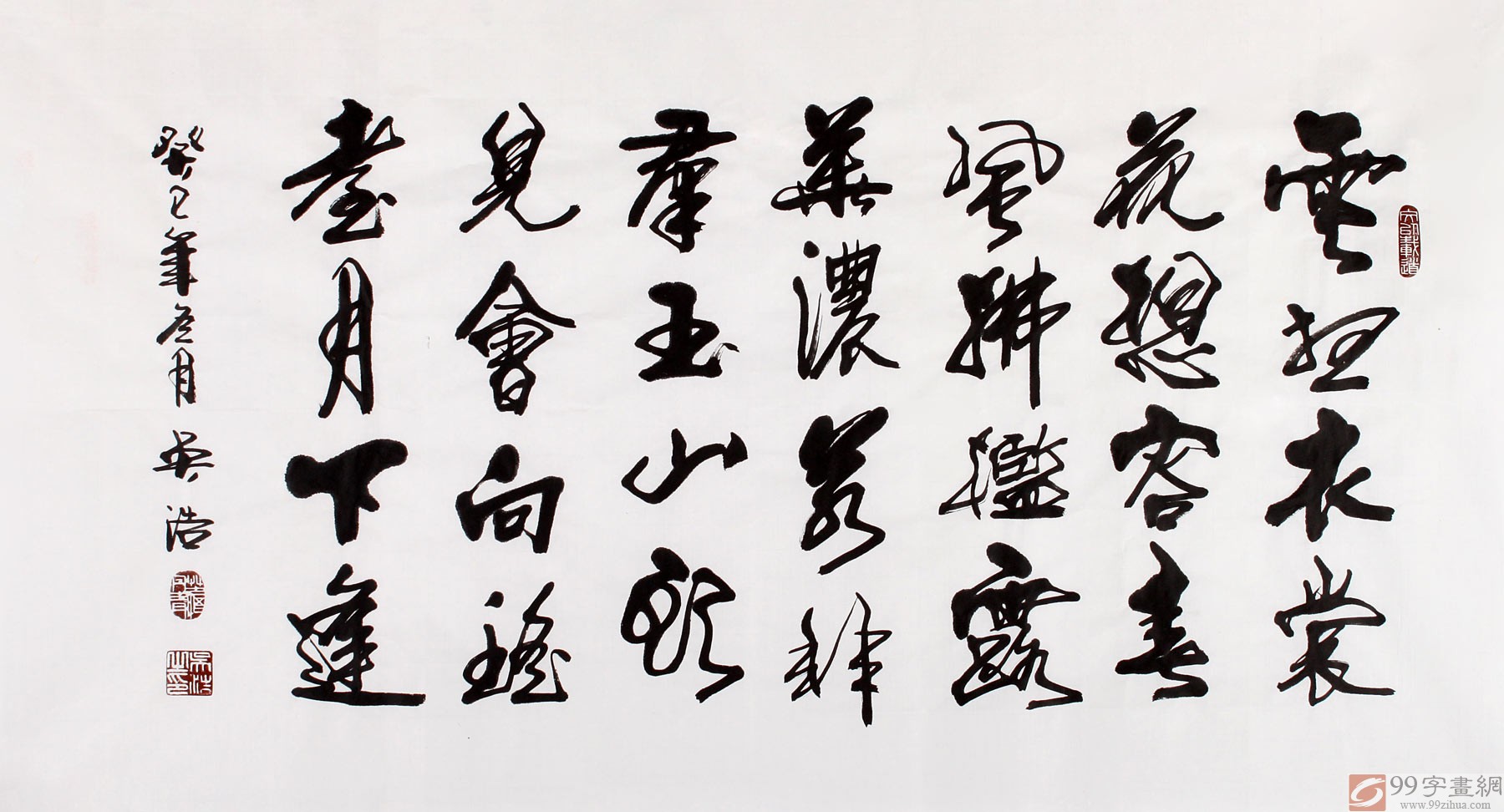 【作品简评】(99字画网艺术评论员路丰) 吴浩先生的书法风格端庄、隽秀、清丽,涉及面广,曲高和寡,雅俗共赏。吴浩先生是当代知名书法家,他的书法作品回草木之气息,山川之动静,日月之晦明等自然现象,陶冶了他书法的自然悟性。同时又刻苦研习古人墨迹,师古不泥古,开拓自我。