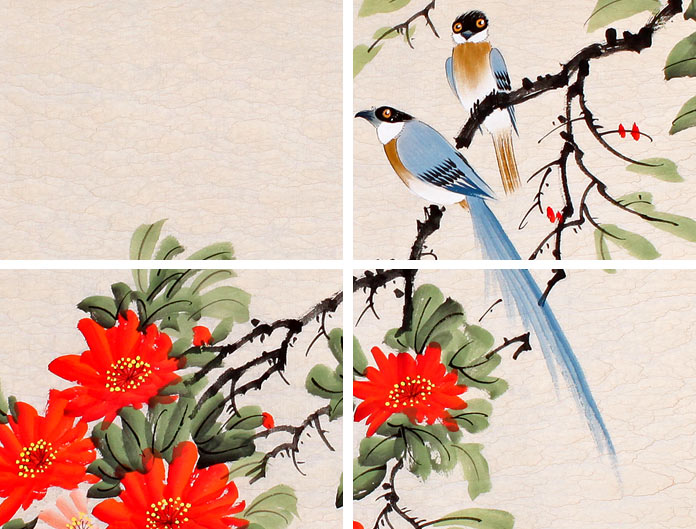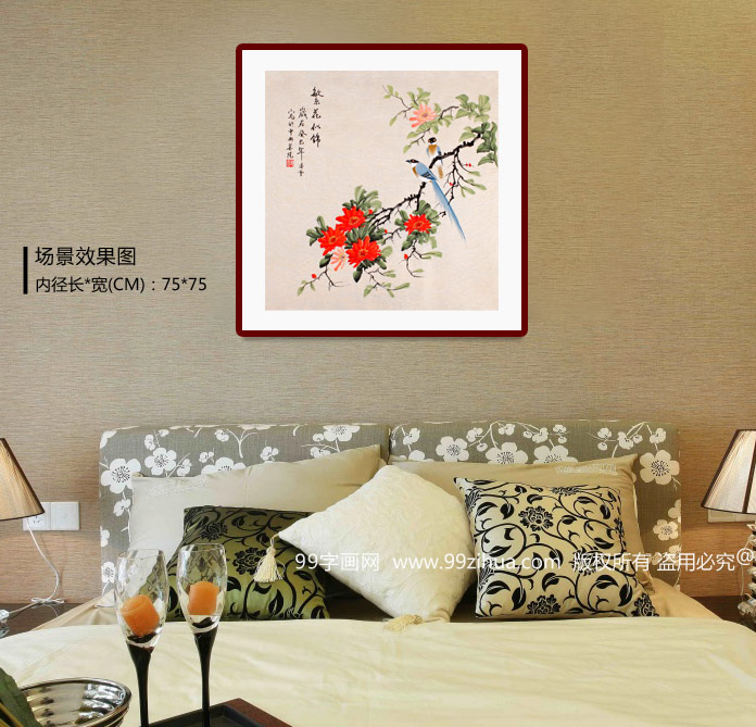 【作品简评】(99字画网艺术评论员晓曼)凌雪老师善于捕捉人间小情小景、鸟语花香的自然美景,用一种轻松自然的笔意,将其进行艺术表现而达到寓情于景、耐人寻味的艺术效果。《繁花似锦》所传达的意境和绘画方面的独特性,正是凌雪艺术特性的集中体现。这幅作品主要画的是花大色艳的繁花和锦鸡图,右上方斜出一株花枝,枝干上有两只锦鸡欣赏此美景,此幅作品画幅虽小,却经得起品味。