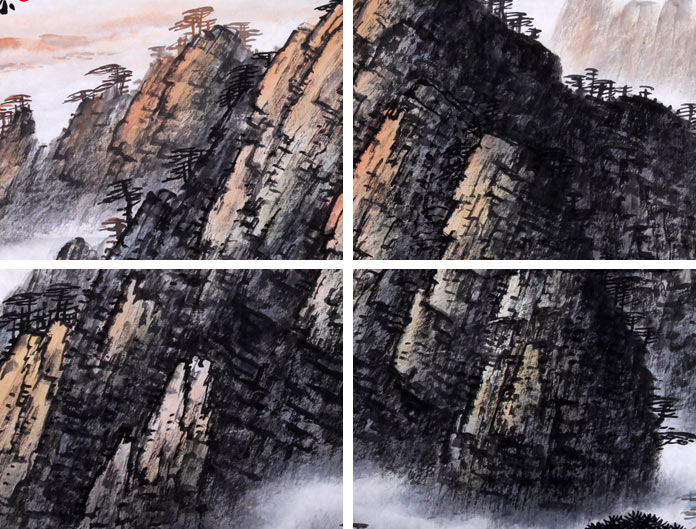 【作品简评】《紫气东来》是张慧仁先生此精品画作,写山状物,色墨精雅,以墨设色,峭壁上怪石嶙峋,山间房屋几舍坐落其间,山脚瀑水长流,源远流长,山涧奇松傲立,松树粗壮劲健,松针刻画细致,岭背石磴陡峭而上,几乎垂直,以至依山趋于云霄,而山腰云雾横锁,愈显山势崎峭险峻。山峰雄奇伟岸、势不可挡的气势藉此描绘而得以尽情发挥,突出了山峰的雄秀险绝。张慧仁的整幅山水画作再现了山峰连绵不断,气势雄伟,幽谷奇峰,其间白云缭绕,更使人神往。左上方又写以秀美飘逸的书法,更增添了此画的文人气息,此乃一幅精品山水画作。
