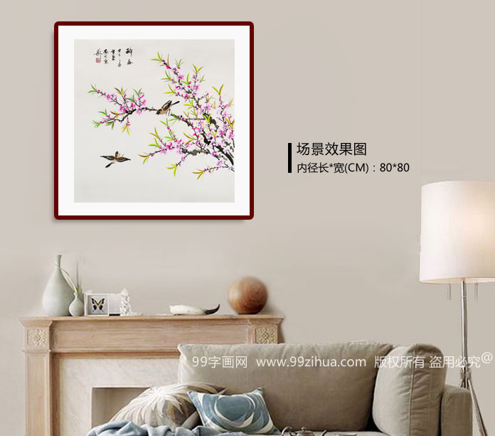 【作品简评】(99字画网艺术评论员路丰)桃花,作为民间新生吉祥物,桃花自古就是春天的象征。早在《诗经》中就有“桃之夭夭,灼灼其华”的歌咏,后世亦常以“桃红柳绿”代指明媚的春光,诗圣杜甫诗句中有“桃花一族开无主,可爱深红爱浅红”、“轻薄桃花逐水流”、“小桃知客意,春尽始开花”、“江上……桃花红似锦”等说法。何华贤先生笔下的桃花图,设色典雅、清秀、绿叶红花相得益彰,恰到好处,此幅作品整体上看造型典雅,笔笔劲力,落落大方,加强了画面的空间感和立体感!