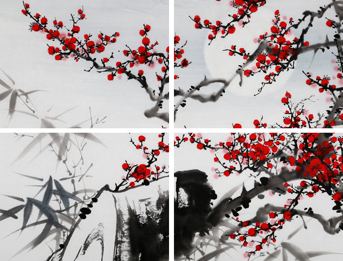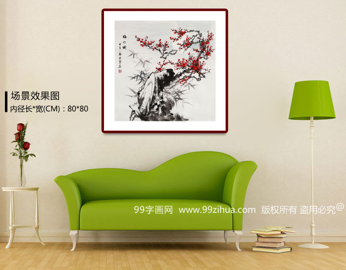 【作品简评】(99字画网艺术评论员路丰)此幅作品绘梅花、竹子两者结合起来画,梅花艳丽,朵朵繁花笑迎而来;竹子劲节有力,枝叶疏密得当,劲节十足,其下一大块墨石映入画幅中,墨韵酣畅,淋漓尽致。整幅作品色墨相间,韵味十足,饱含生机勃勃之感,耐人品味!