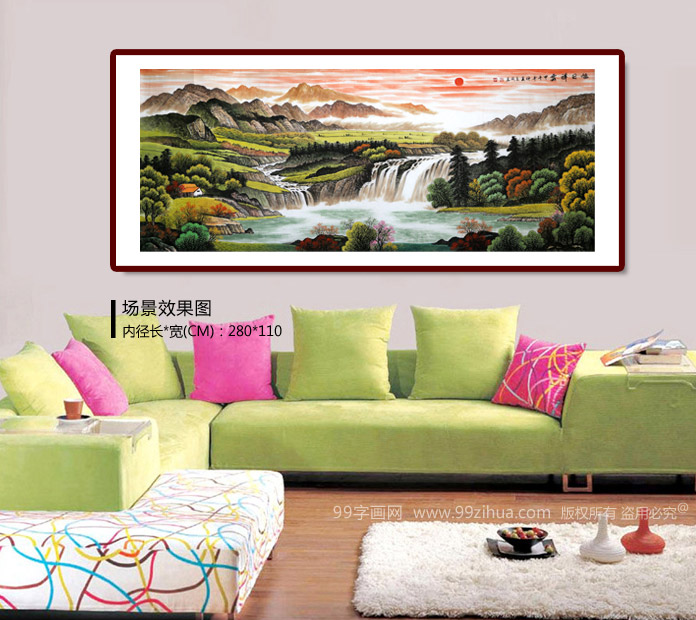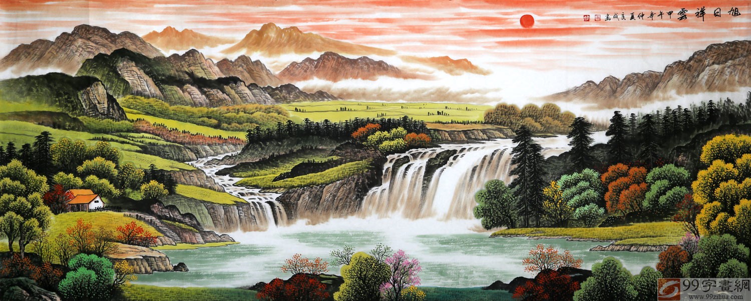 【作品简评】此幅聚宝盆风水画《旭日祥云》大气磅礴中蕴含风水,红日寓意:“鸿运当头”;瀑布寓意:财源滚滚;水潭寓意:“聚宝盆”;整幅作品满含鸿运当头,财运如浩浩瀑水,生生不息之意。作品中远山层峦叠峰,更表达了泉源广长、宝潭聚财的意境。风水上说:“山管人丁,水管财”。因此不管是客厅、办公室、经商场所挂这幅山水画都是非常吉利的。