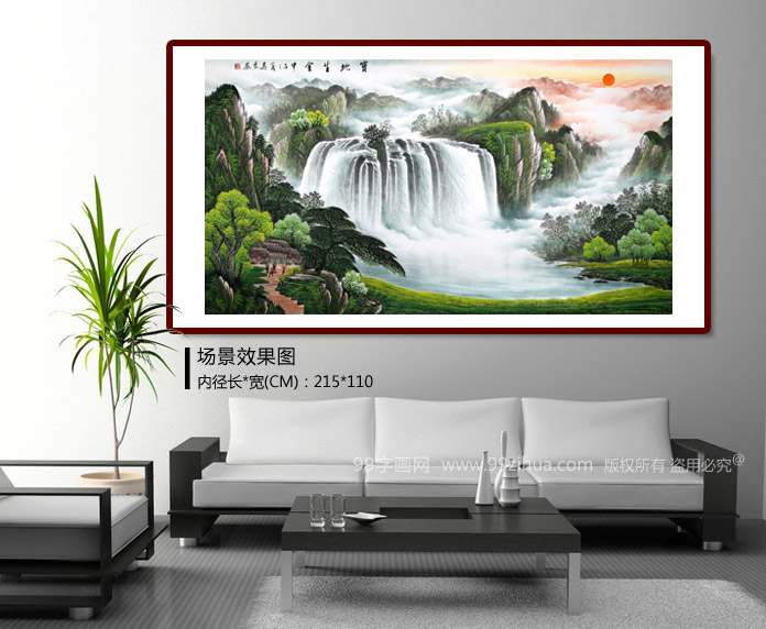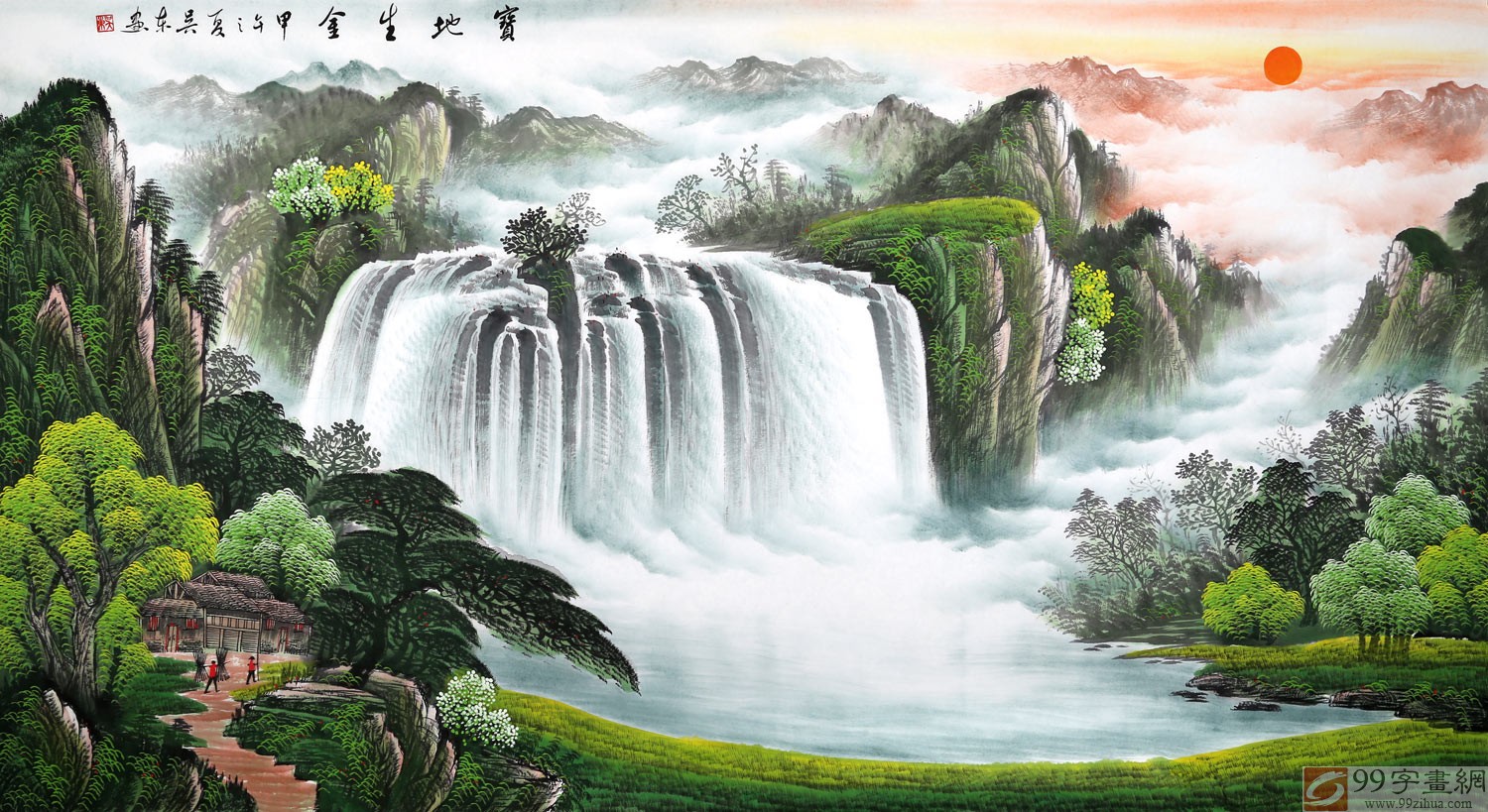 【作品简评】(99字画网艺术评论员路丰)吴东先生的聚宝盆山水画《宝地生金》是老师近期力作,画面绘远处一轮红日在天边冉冉升起,朝霞渲染着整个山顶,云雾缭绕,山峰雄伟壮观,树木丛生,房屋数间,这使整个画面更加充满生机感。近景突出了主人砍柴归来,温馨而又清新的画面映入眼帘,让人观之一幕顿觉醒悟,眼前一亮。此幅聚宝盆山水寓意吉祥,富含风水,其中“瀑布”象征财源不断,有招财之含意。“红日”有好兆头,鸿运当头之意,同时也是希望,吉祥的象征,挂在家居客厅,办公室不仅营造好的风水,而且具有良好的装饰效果。