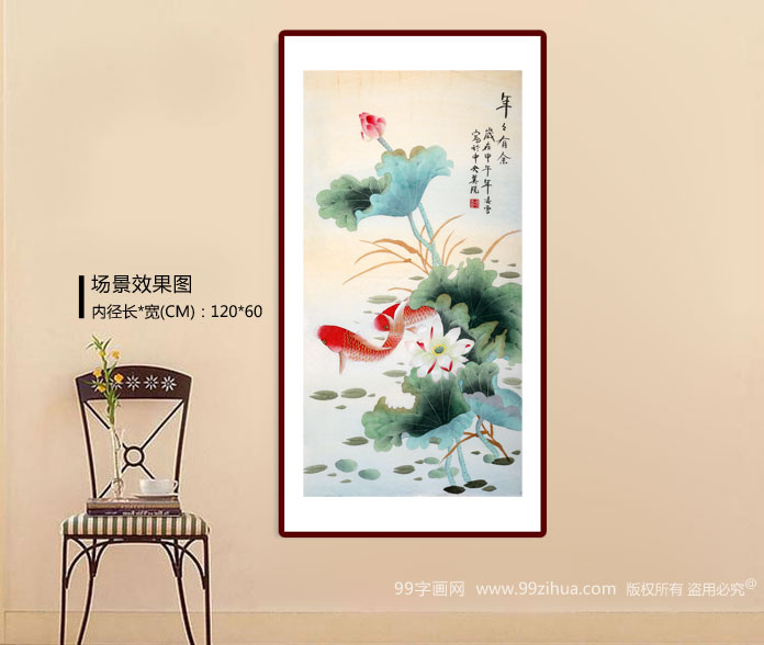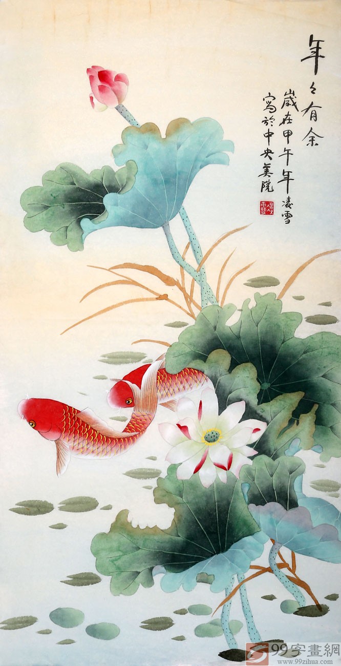 【作品简评】(99字画网艺术评论员玉洁) 此幅《年年有余》,画面淡雅清丽,几株荷花衬托得更加真实自然。两条红色鲤鱼各具神态,或跳跃,或前冲,或藏荷躲迷,极富艺术效果。鱼象征着吉庆有余。此幅《年年有余》图散发着古朴而传统的文化情结,具有很大的观赏价值。