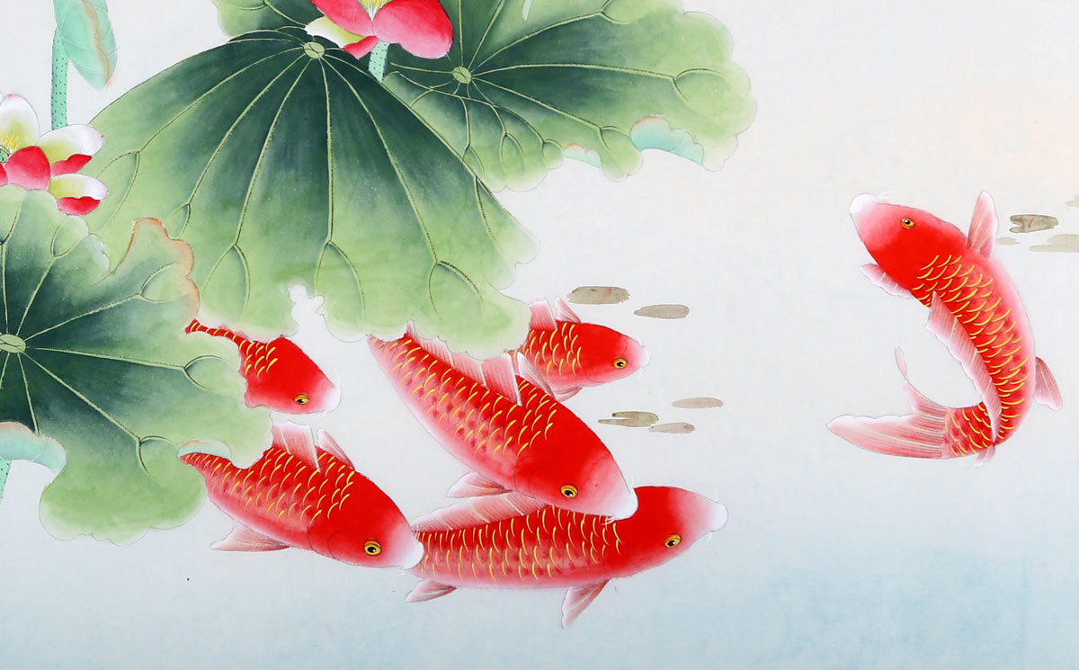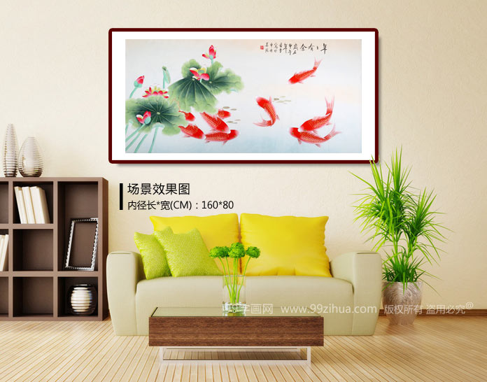 【作品简评】(99字画网艺术评论员玉洁)此幅《年年有余》九鱼图,幅绘九条喜庆可爱九鲤鱼,九条鲤鱼你追我赶,嬉闹玩耍,遨游于大海之中,荷花花叶硕大,叶绿肥厚,遮挡游动前行的鱼儿,荷叶翠绿,青翠欲滴,在辽阔的背景衬托下更显清新亮丽,是客厅良好风水字画之选,郑重推荐大家选购!