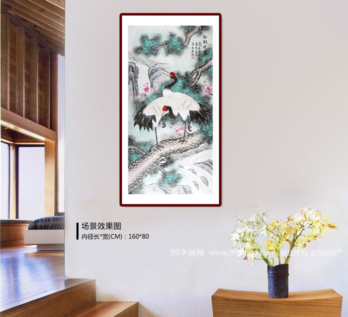 【作品简评】(99字画网艺术评论员玉洁)松鹤延年,是祝寿老人健康长寿、寿比南山等的字画作品,松树经冬不凋,寿龄长久,寓长生等;鹤,在民间被称为仙物,是长生不老的象征,两者恰当地结合在一起,演绎出一幅吉祥祝寿的字画来。此幅作品赠送老人,祝老人健康长寿!